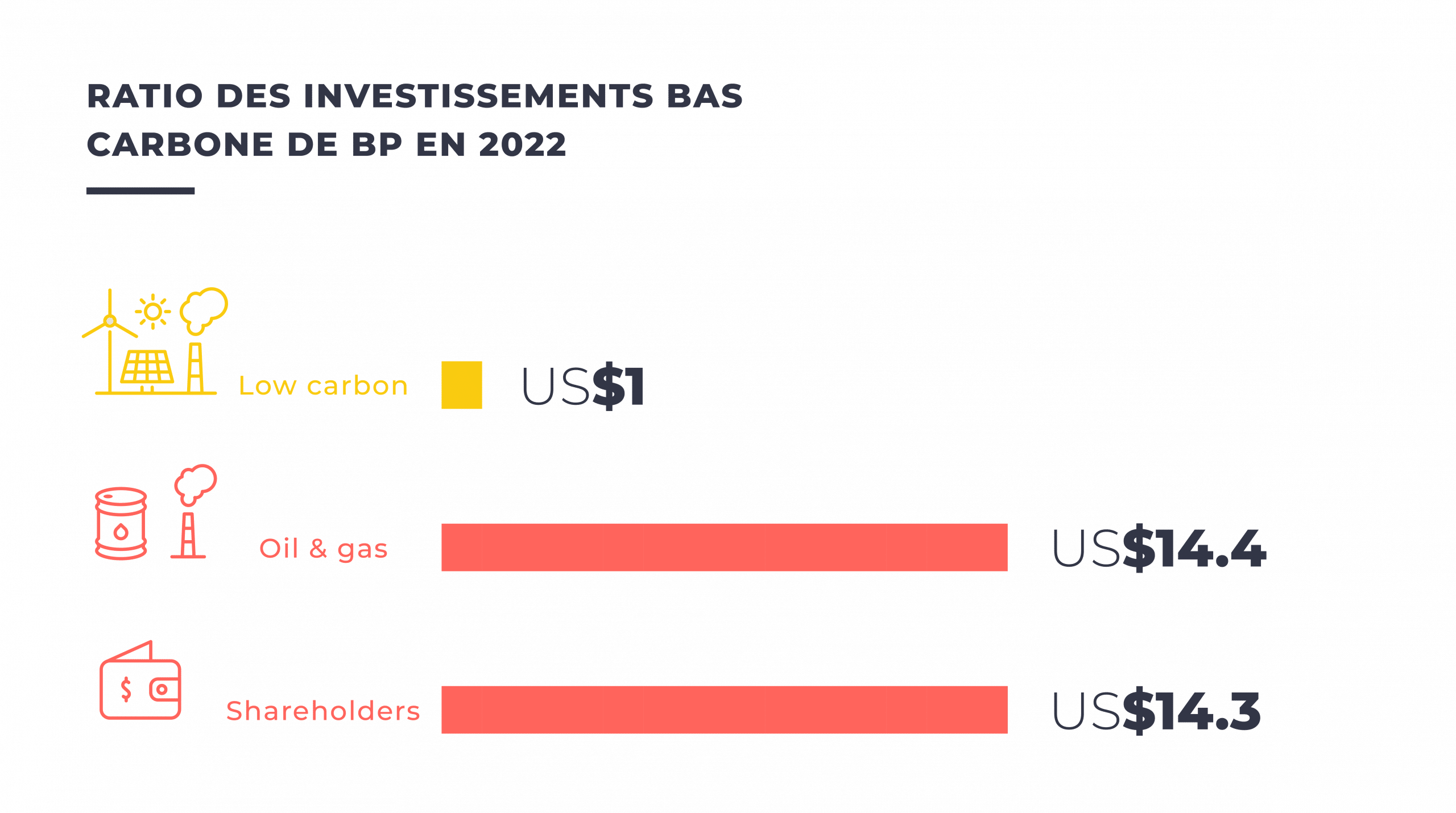 Pour chaque dollar investi dans sa division « bas carbone » en 2022, BP a investi plus de 14 dollars dans le pétrole et le gaz. Si l’on tient compte du fait que la division « bas carbone » de BP comprend des sources d’énergie non renouvelables, pour chaque dollar investi dans les énergies fossiles, moins de sept centimes ont été investis dans des énergies renouvelables durables.