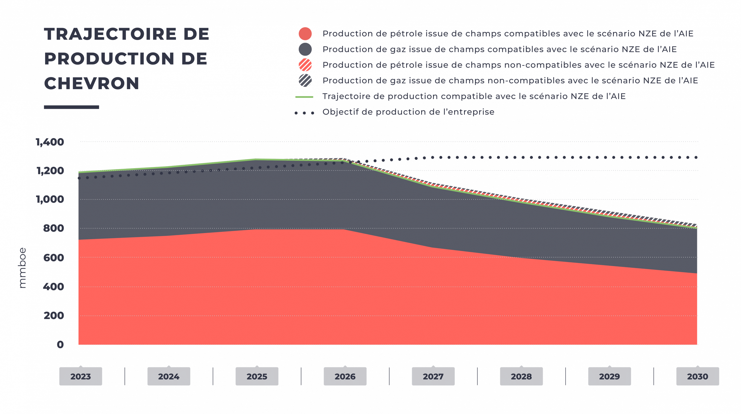 Avec son objectif de production de pétrole et de gaz à 2027 et avec l’hypothèse d’un maintien de la production à son plateau au-delà, la production de Chevron en 2030 serait supérieure de 62 % à celle requise selon le scénario NZE.