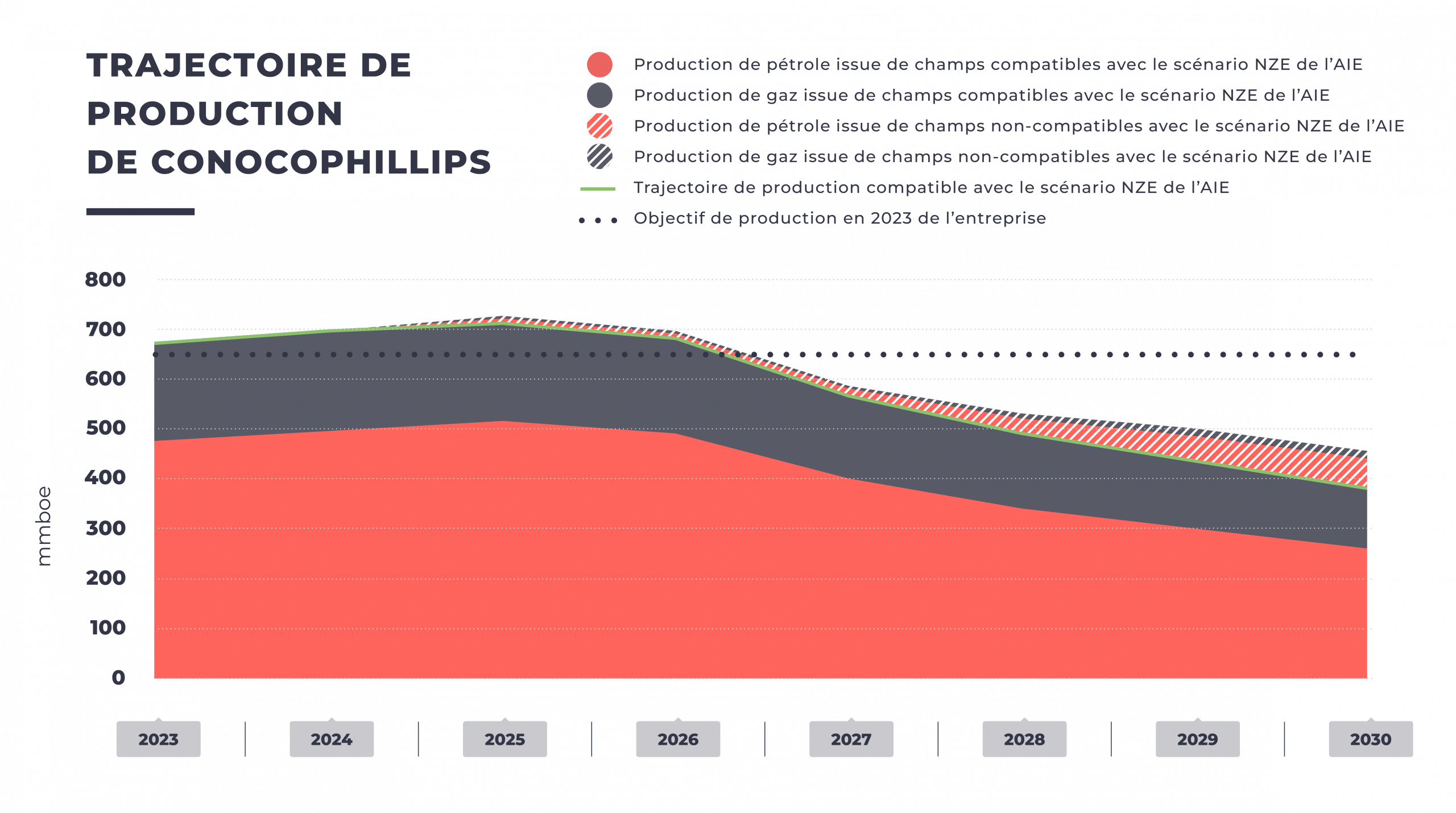 ConocoPhillips ne publie pas d’objectif de production de pétrole et de gaz au-delà de 2023. Si ConocoPhillips maintient sa production de pétrole et de gaz d’ici 2030 au niveau de son objectif 2023, sa production serait supérieure de 71 % % à celle requise selon le scénario NZE.