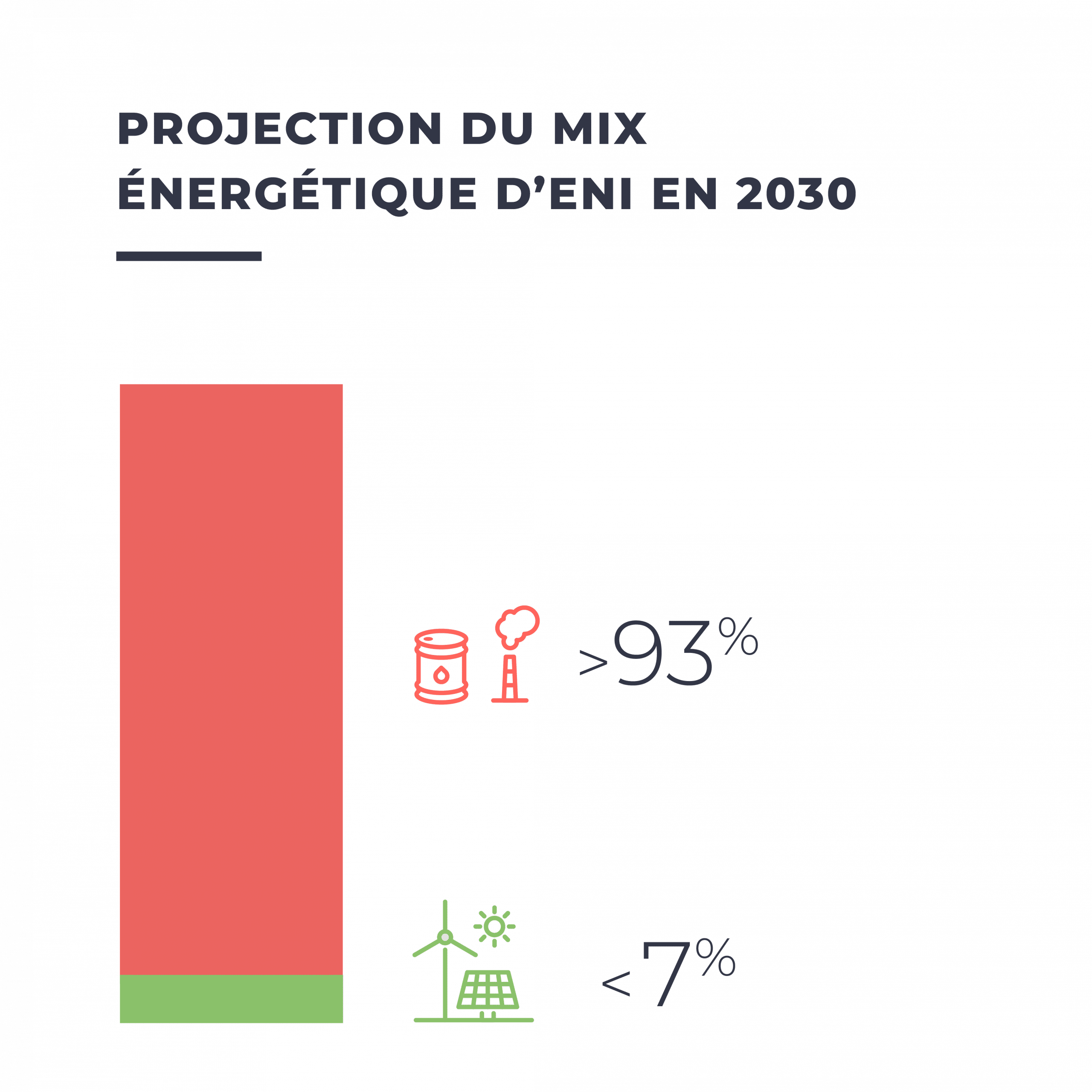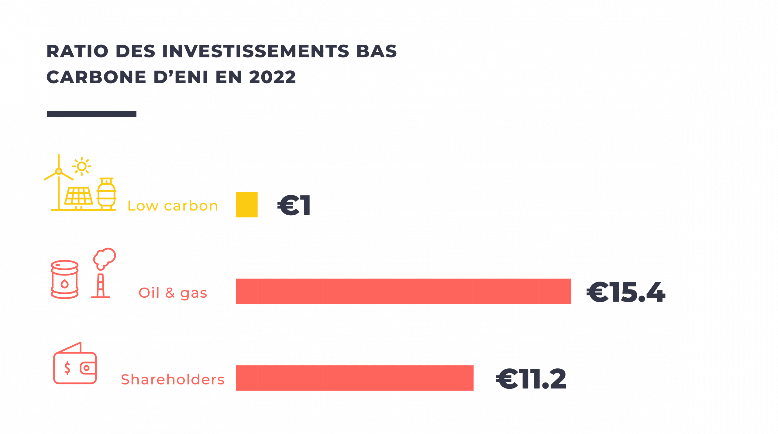 Pour chaque euro investi en 2022 dans « Plenitude » – sa division bas carbone –, Eni a investi plus de 15 euros dans le pétrole et le gaz. En tenant en compte le fait que « Plenitude » comprend des activités liées aux énergies non renouvelables, telles que la commercialisation du gaz et la vente, pour chaque euro investi dans les combustibles fossiles, moins de sept centimes ont été investis dans les énergies renouvelables durables.