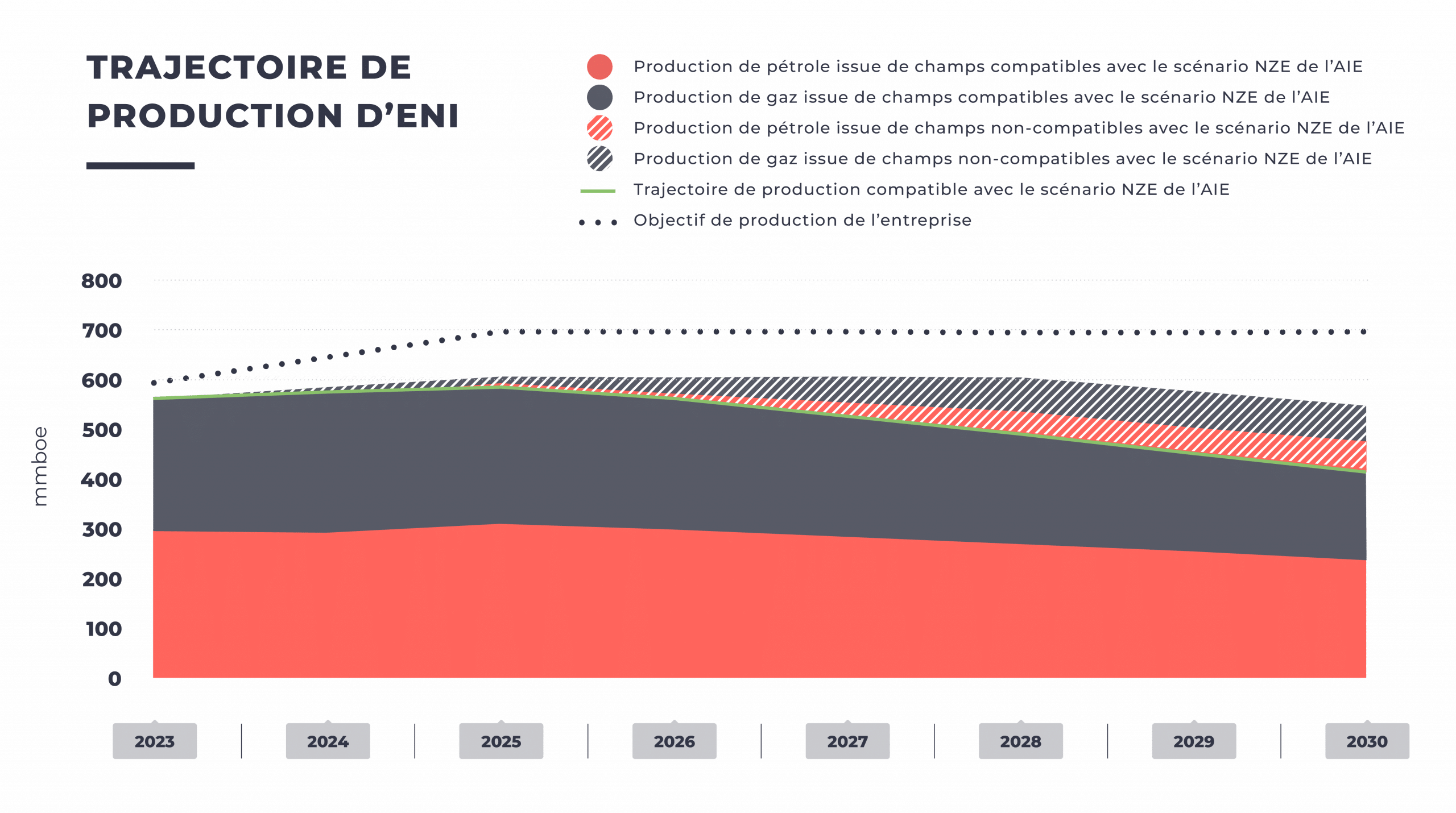 L’intensité carbone visée par Eni en 2030 est de 22 % supérieure à celle du scénario NZE et de 9 % supérieure à celle d’un scénario en dessous de 2°C. Si Eni atteint ces cibles et réduit sa production d’énergie conformément aux scénarios NZE et APS de l’AIE, Eni aura dépassé sa part du budget carbone 2023-2030 de 22 % par rapport aux émissions possibles dans le scénario NZE et de 5 % par rapport à celles émises dans le scénario APS.