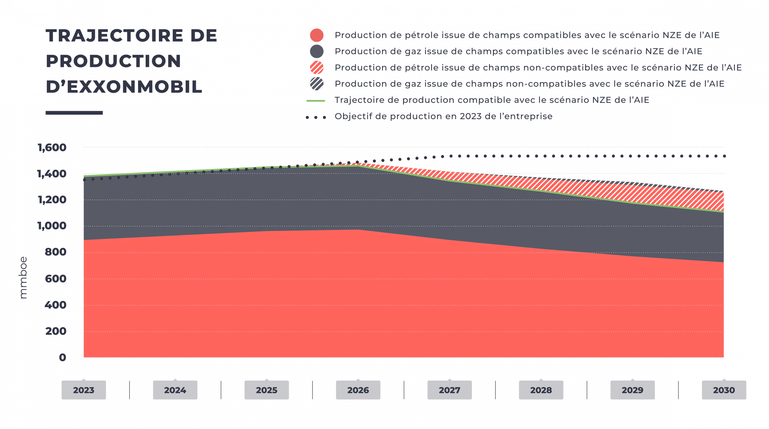 Avec son objectif de production de pétrole et de gaz à 2027 et avec l’hypothèse d’un maintien de la production à son plateau au-delà, la production d’Exxonmobil en 2030 serait supérieure de 39 % à celle requise selon le scénario NZE.