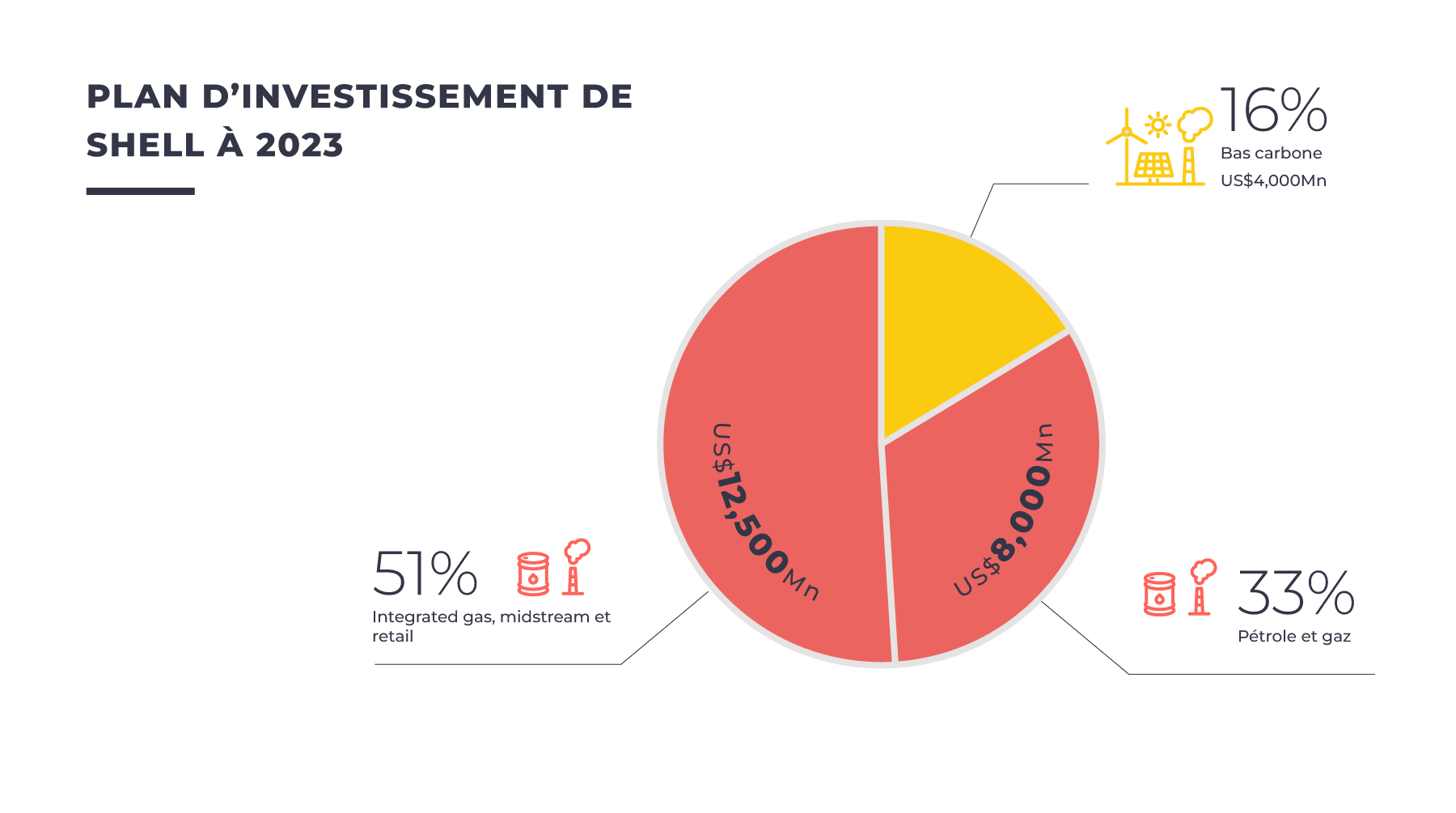 En 2022, Shell a alloué 21,1 milliards de dollars au pétrole et au gaz, dont 8,1 milliards aux activités upstream. Parallèlement, Shell a investi 298 millions de dollars dans sa division « Renewables & Energy Solutions ».