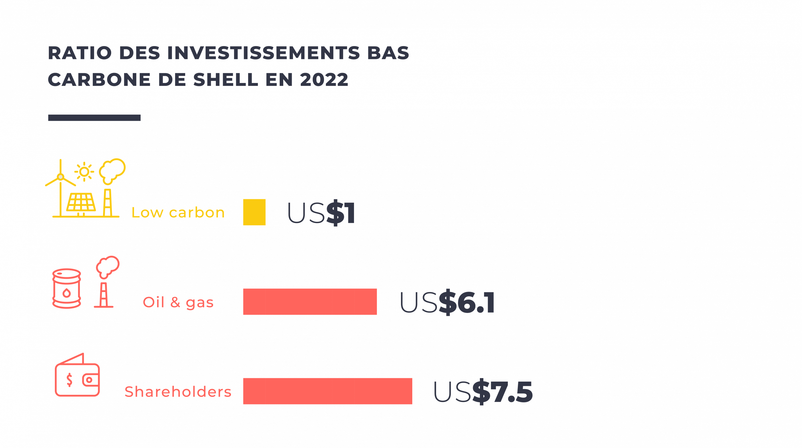 Pour chaque dollar investi dans sa division « Renewables & Energy solutions » en 2022, Shell a investi plus de 6 dollars dans le pétrole et le gaz. Si l’on tient compte du fait que la division « Renewables & Energy solutions » de Shell comprend des sources d’énergie non renouvelables, pour chaque dollar investi dans les combustibles fossiles, moins de 16 cents ont été investis dans les énergies renouvelables durables. Pour chaque dollar investi dans la division « Renewables & Energy solutions » en 2022, plus de 7 dollars ont été distribués aux actionnaires sous forme de dividendes et de rachats d’actions.