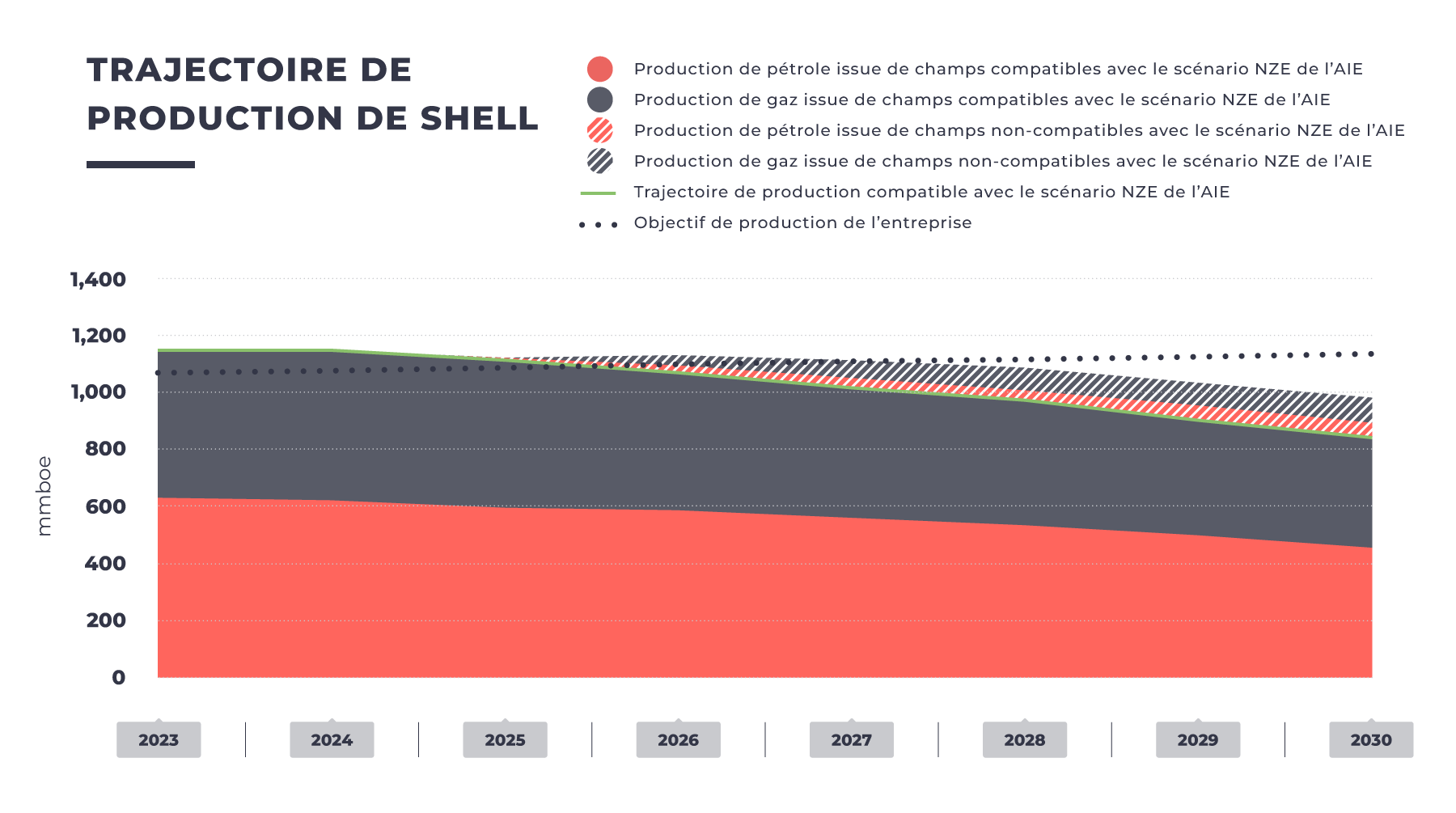 Shell prévoit de maintenir sa production pétrolière d’ici à 2030 et un mix composé alors de 45 % de pétrole et de 55 % de gaz. Avec cet objectif, sa production sera supérieure de 35% au niveau requis pour s’aligner sur les NZE.