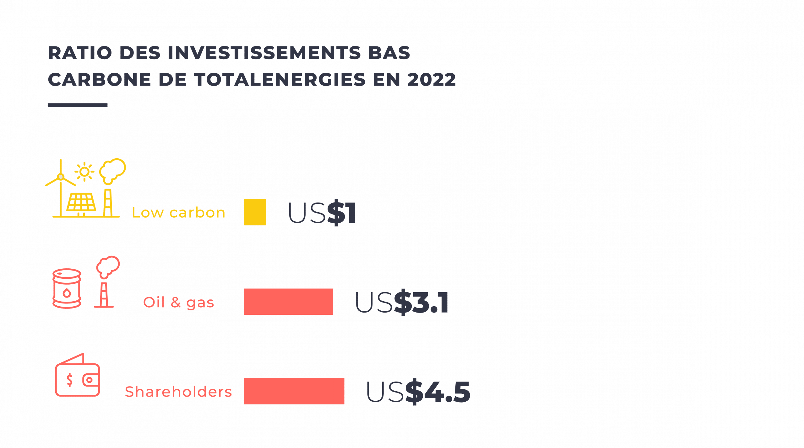 Pour chaque dollar investi dans la division iGRP en 2022, TotalEnergies a investi plus de 3 dollars dans le pétrole et le gaz. En tenant en compte le fait que la division iGRP de TotalEnergies comprend des activités liées aux énergies non renouvelables, telles que les centrales à gaz, pour chaque dollar investi dans les combustibles fossiles, moins de 33 cents ont été investis dans les énergies renouvelables durables. Pour chaque dollar investi dans la division iGRP en 2022, plus de 4 dollars ont été distribués aux actionnaires sous forme de dividendes et de rachats d’actions.