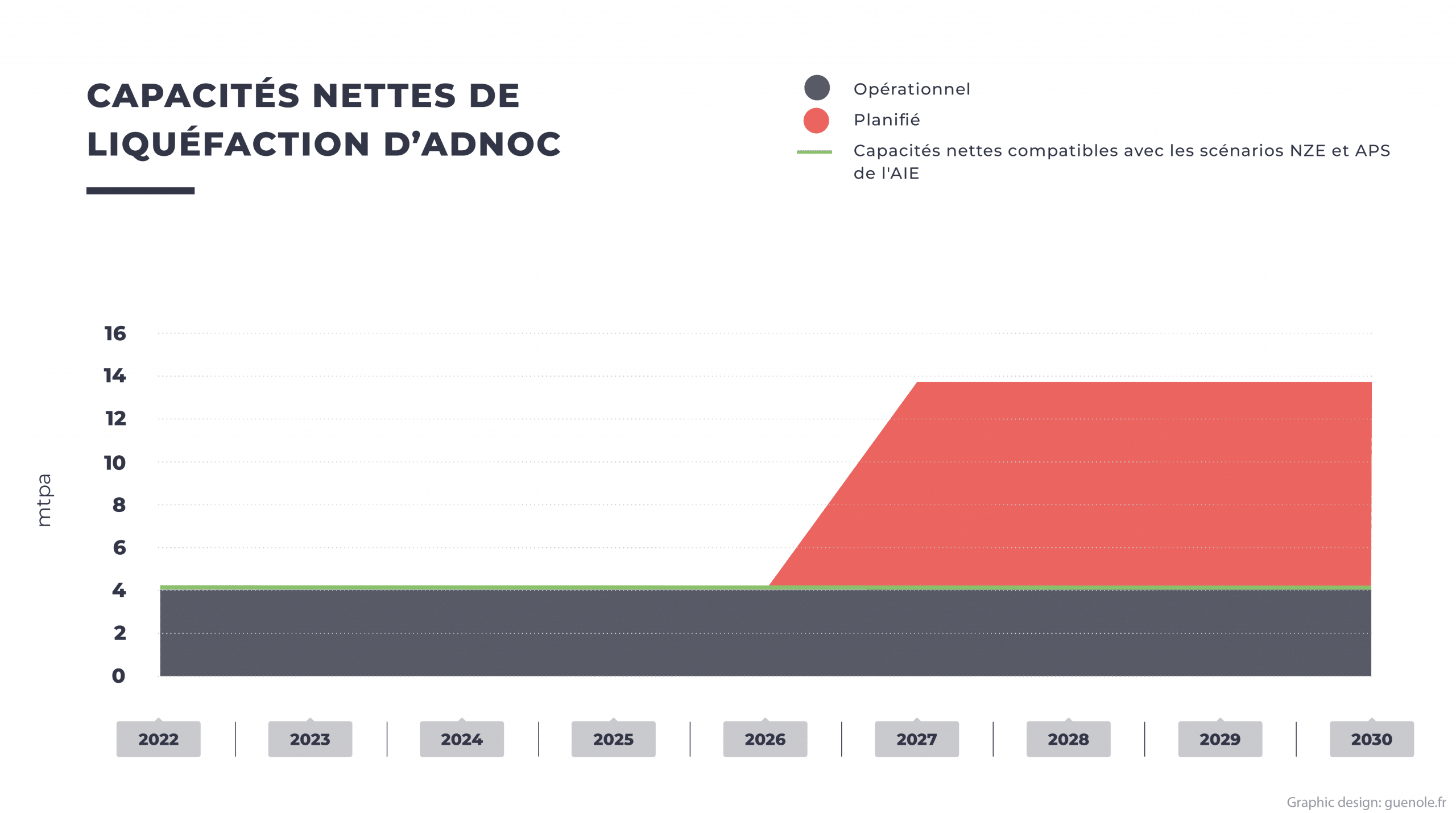 En plus du développement de nouveaux champs, ADNOC prévoit de construire un nouveau terminal d’exportation de GNL aux Emirats Arabes Unies et participe à un projet de nouveau terminal d’importation aux Pays-Bas. Aucun de ces terminaux ne sont compatibles avec le scénario NZE.