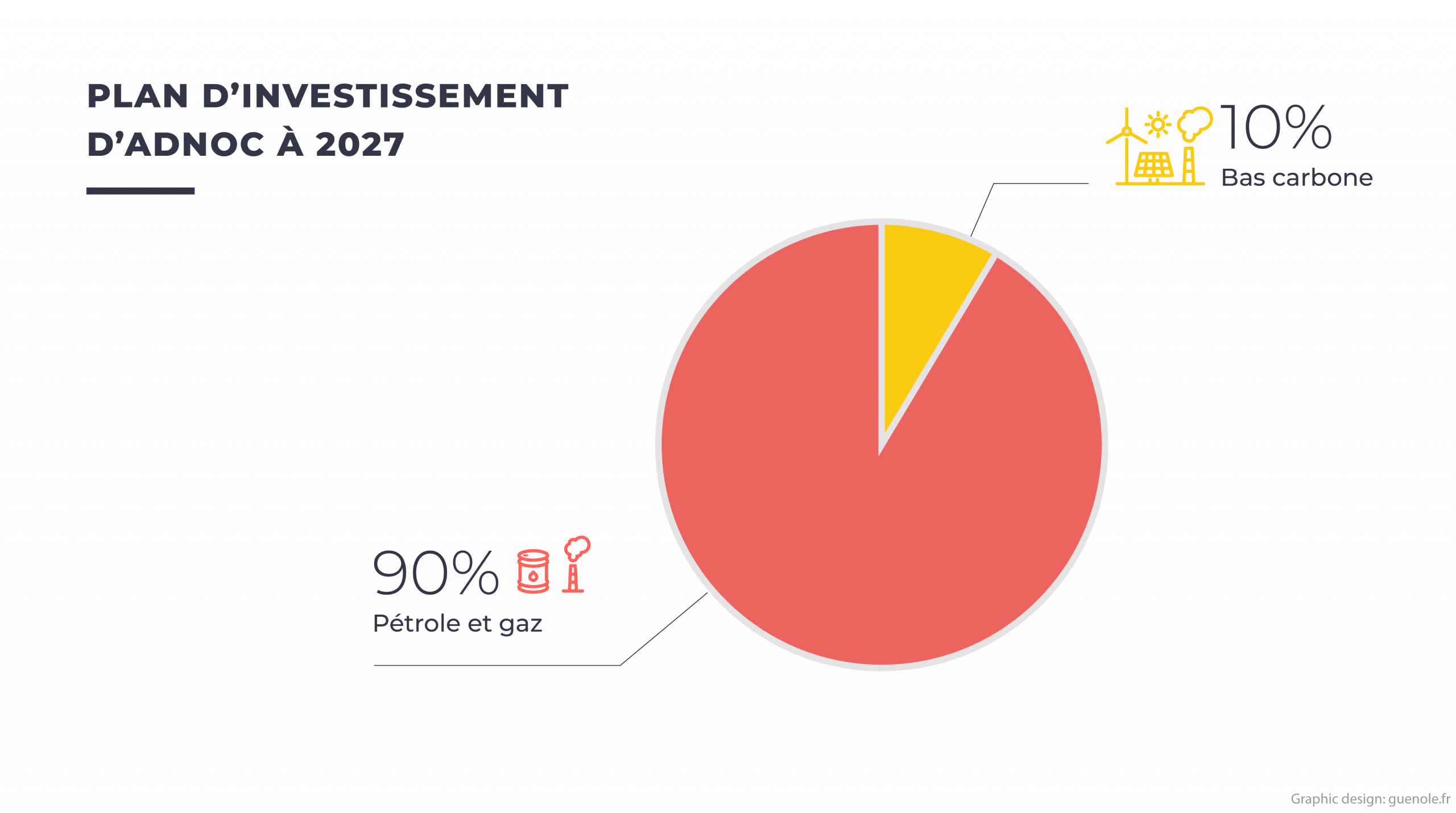 ADNOC étant un groupe privé détenu par l’Etat des Emirats Arabes Unies, le niveau de transparence sur les résultats financiers consolidés et la mise en œuvre de la stratégie climatique du groupe est très faible. Par conséquent, les investissements déjà réalisés dans le secteur des énergies bas carbone ne sont pas publiés.