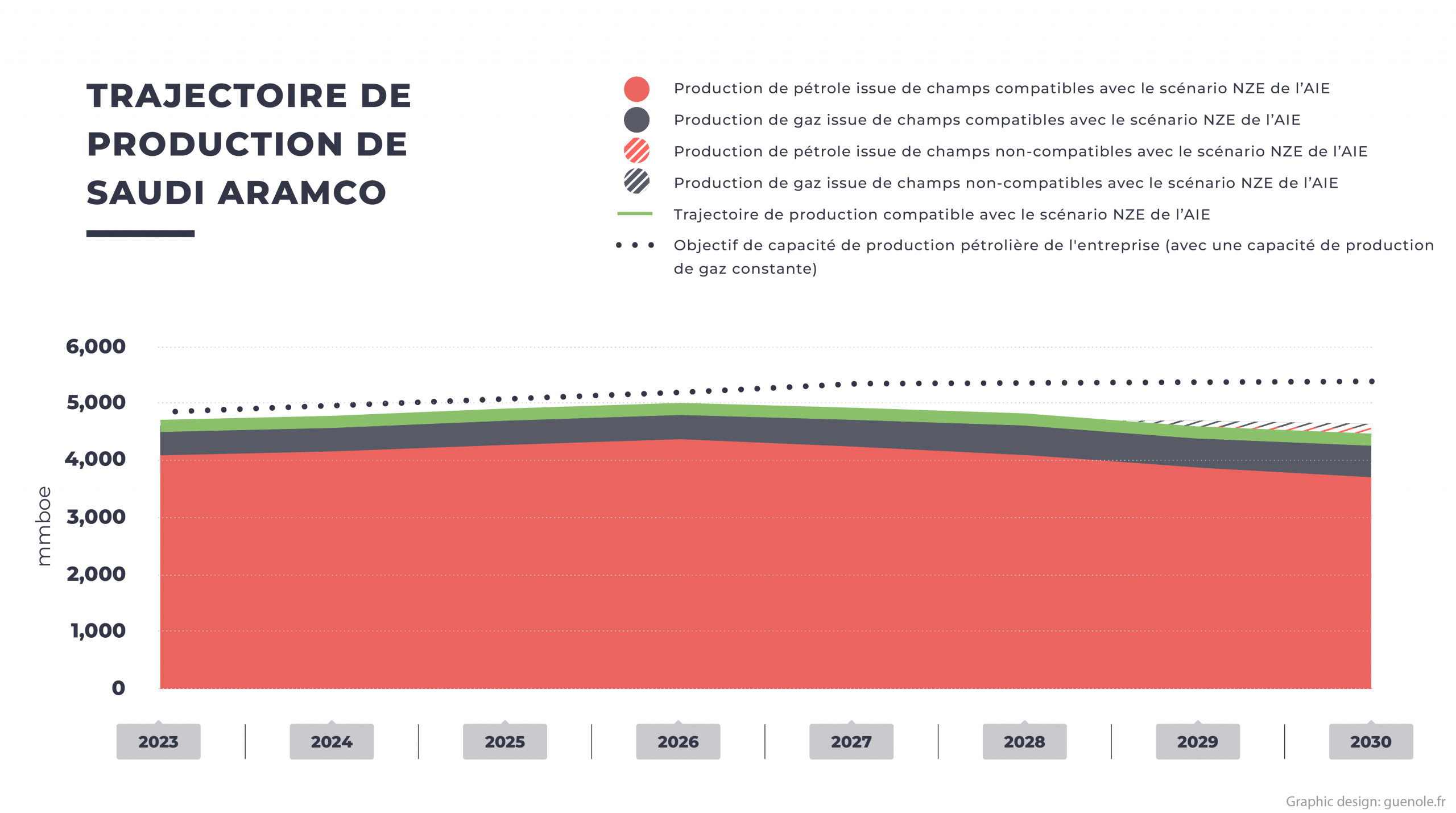 Si Saudi Aramco produit au maximum de ses capacités de production pétrolières visées en 2030, la production de l’entreprise dépassera de 23% la production requise pour s’aligner sur le scénario NZE.